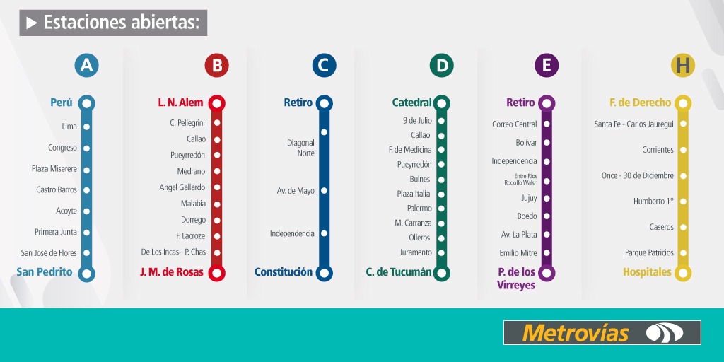 - Línea E: Retiro, Correo Central, Bolívar, Independencia, Entre Ríos, Jujuy, Boedo, Av. La Plata, Emilio Mitre y Plaza de los Virreyes.