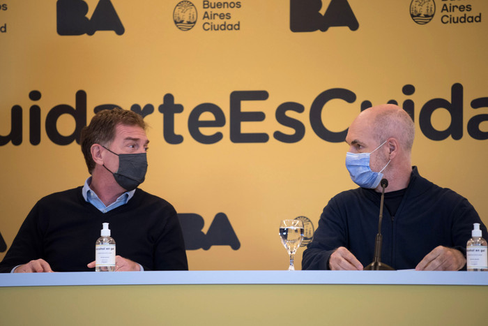 Horacio Rodríguez Larreta acompañado por el vicejefe de Gobierno porteño, Diego Santilli; el jefe de Gabinete, Felipe Miguel; la ministra de Educación, Soledad Acuña; el ministro de Salud, Fernán Quirós; y el ministro de Desarrollo Económico y Producción, José Luis Giusti, informó sobre las nuevas medidas que entran en vigencia a partir hoy viernes.