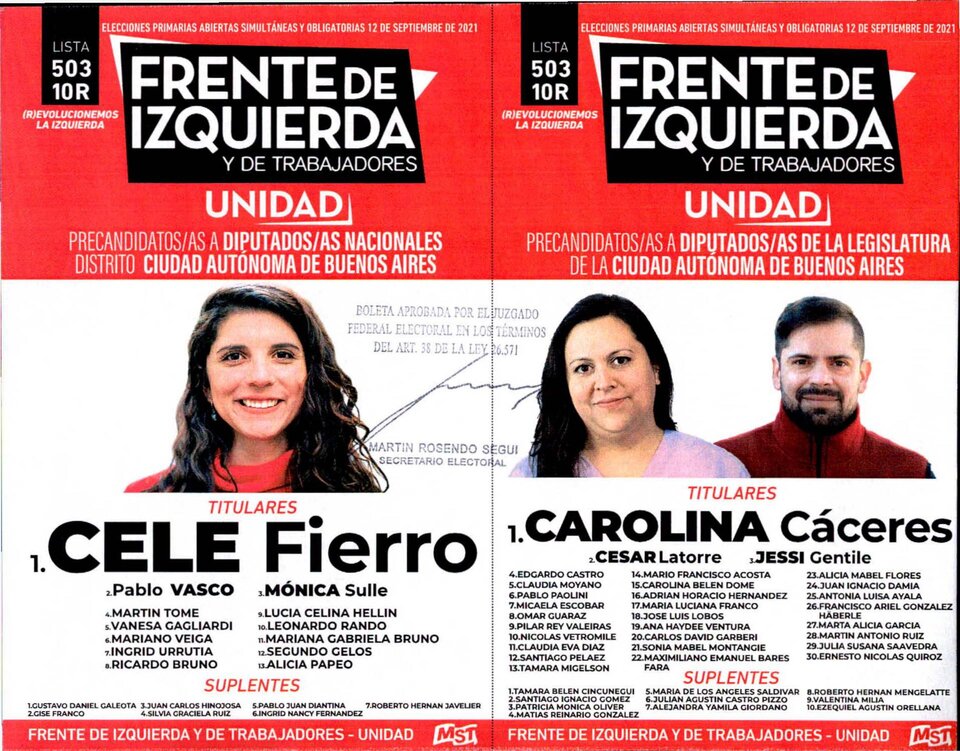 Por el otro lado estará la 503 R 10 “Revolucionemos la izquierda” encabezada por Celeste Fierro en la categoría diputados nacionales acompañada por Pablo Vasco y Mónica Sulle y son su candidatos a legisladores porteños Carolina Cáceres, Cesar Latorre y Jessi Gentile.