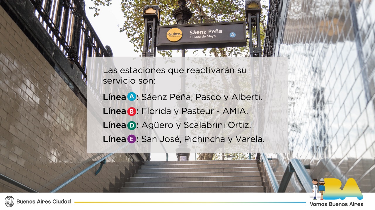 Las estaciones que reabrieron sus puertas son Sáenz Peña, Pasco y Alberti (Línea A), Florida y Pasteur-Amia (Línea B), Agüero y Scalabrini Ortiz (Línea D), y San José, Pichincha y Varela (Línea E) de esta forma la red quedará completamente operativa.