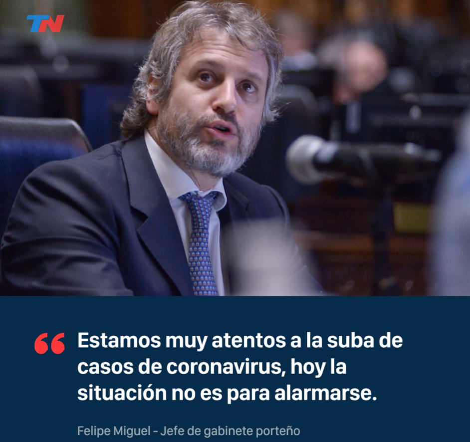 El jefe de Gabinete de la Ciudad de Buenos Aires, Felipe Miguel, sostuvo en las últimas horas que el aumento de contagios que se registra en la Ciudad “no es para alarmarse” y agregó que “lo más importante” es que los ciudadanos tengan “plena conciencia de lo importante” que es su conducta “para seguir sosteniendo la apertura de las actividades”. “Hay pocas restricciones y eso es gracias al esfuerzo de la gente. Depende mucho de nosotros que no tengamos que dar marcha atrás”.