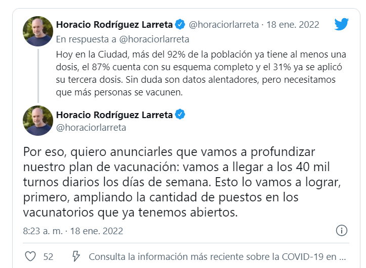 Larreta continuo señalando “Vamos a profundizar más aún nuestro plan de vacunación. Hace semanas, nos habíamos comprometido a llegar a 36 mil turnos diarios. No solo cumplimos ese objetivo sino que lo vamos a superar, porque para el fin de esta semana vamos a estar en los 40 mil turnos diarios durante los días de semana”, anunció Rodríguez Larreta.