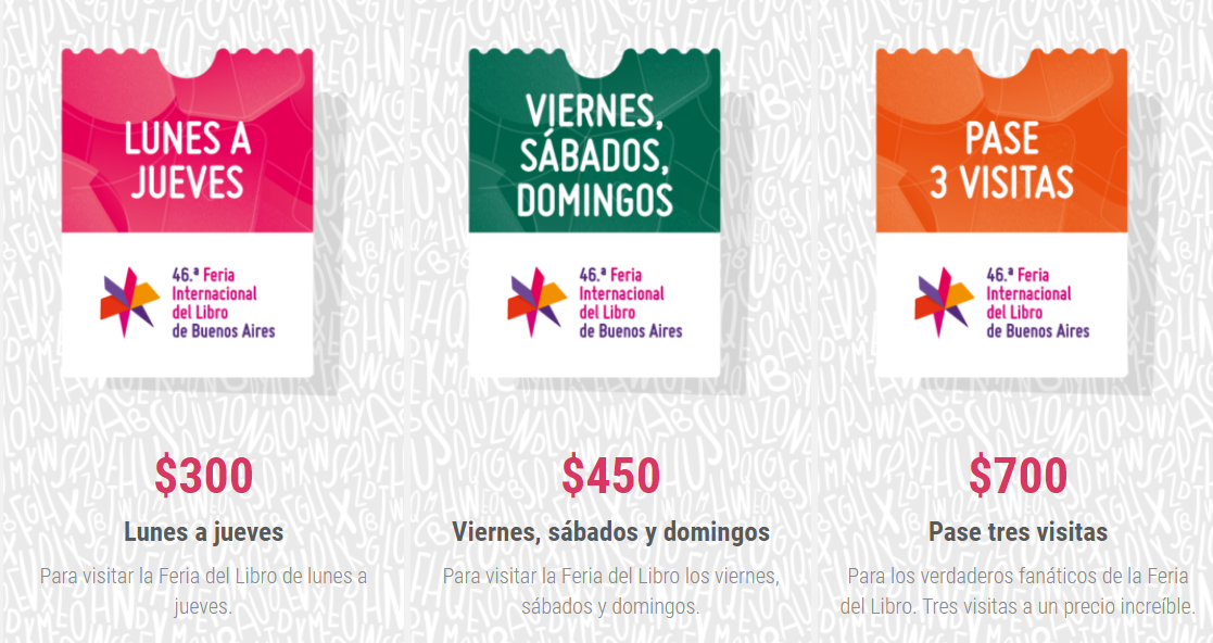 Quienes no cumplan con ninguna de estas condiciones deberán abonar la entrada, que se podrá comprar online en la página de la Fundación El Libro o en las boleterías de la Feria, y que tendrá un costo de $300 de lunes a jueves, $450 viernes, sábados y domingos, y $700 el pase por tres días (solo venta online).